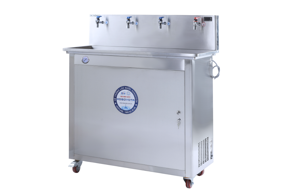 – Có tủ Inox bảo vệ, có khay thoát nước thừa – Có 4 vòi lấy nước 1 Nóng – 3 Nguội – Có bánh xe đẩy di chuyển dễ dàng |