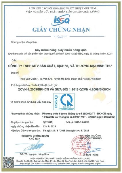 + Chứng nhận sản phẩm Cây nước nóng, Cây nước nóng lạnh Phù hợp với Quy chuẩn kỹ thuật quốc gia QCVN 4:2009/BKHCN VÀ SỬA ĐỔI 1:2016 QCVN 4:2009/BKHCN.