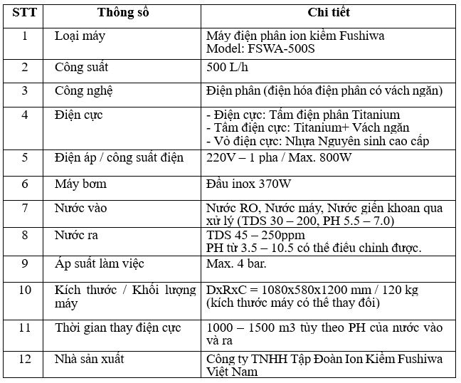 Thông số kỹ thuật máy điện phân ion kiềm công suất 500L/h